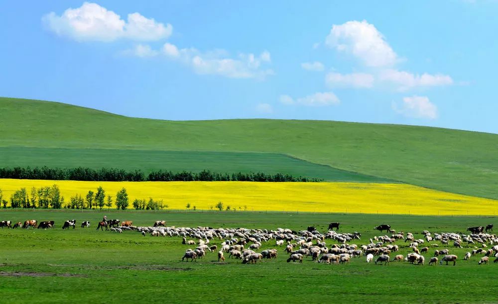 遥望那一片片绿色的海洋,那是内蒙古的大草原,这里的草原,不同于江南的细腻,不同于塞北的粗犷,它有着自己独特的韵味,那是一种粗犷与细腻交织的韵味,一种豪放与温婉并存的风情。